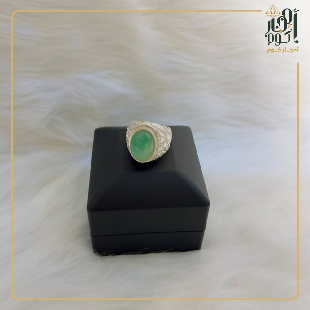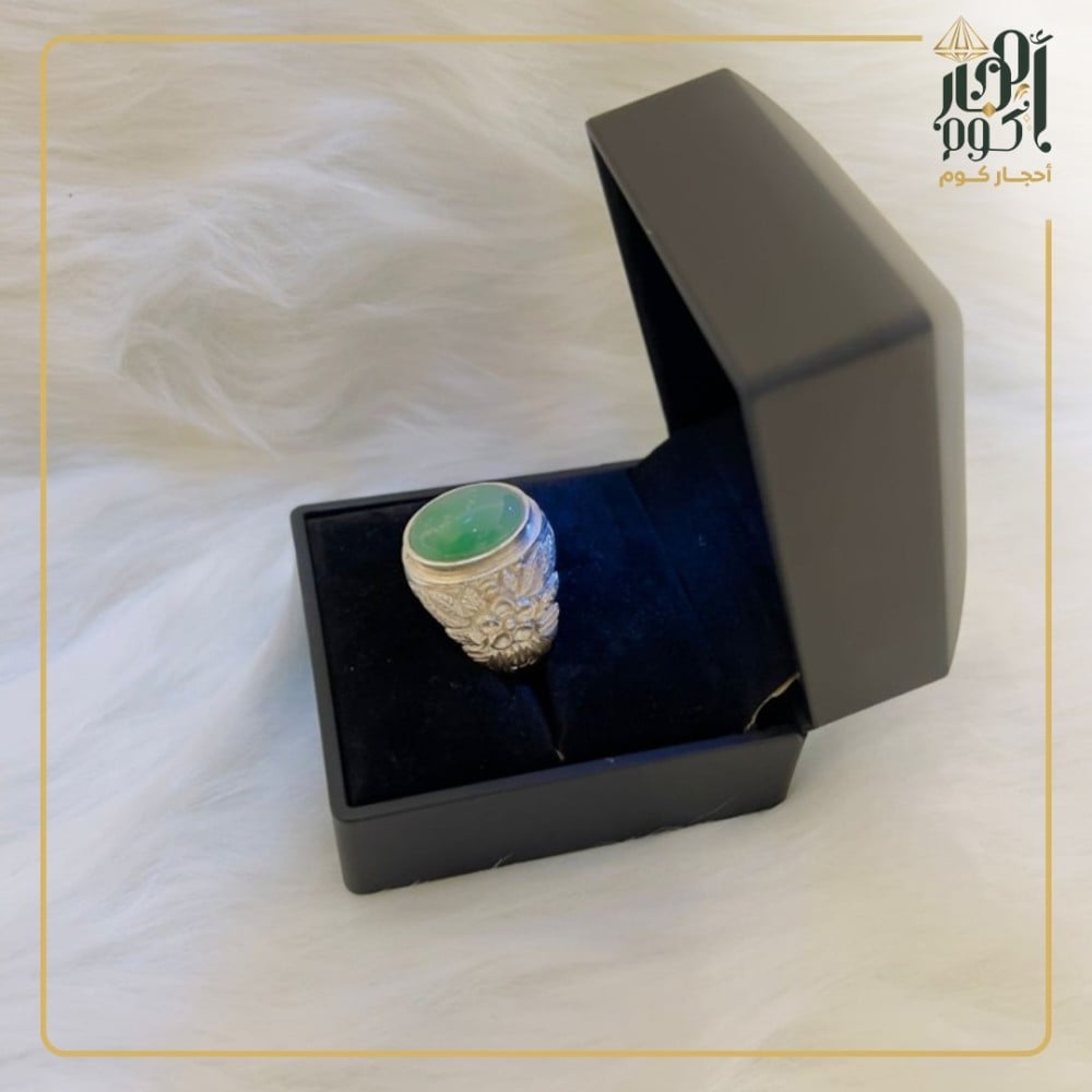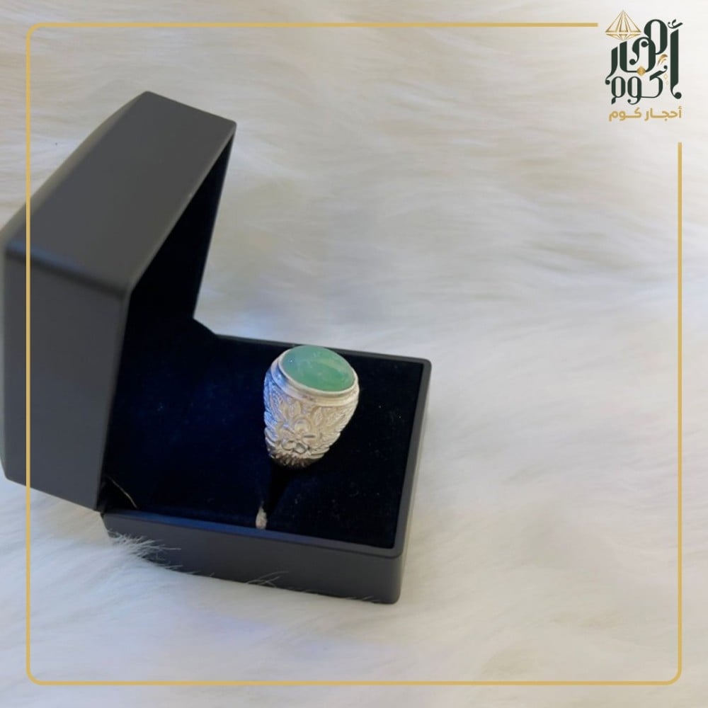 خاتم الفضة المصاغ يدويًا والمتوج بحجر اليشم الأخضر الطبيعي يعتبر قطعة فنية رائعة وفريدة من نوعها. يمتاز هذا الخاتم بتفاصيله الدقيقة والحرفية العالية في الصياغة، حيث يتم صنعه بعناية يدوية باستخدام الفضة الخالصة. يتميز حجر الجاد الأخضر الطبيعي بلونه المميز وجماله الطبيعي، والذي يضفي على الخاتم سحرًا خاصًا.