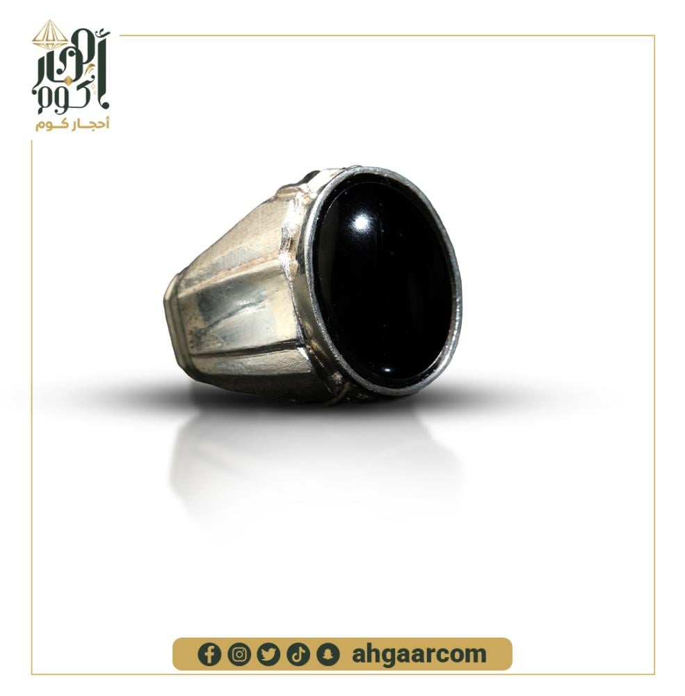 يتميز هذا الخاتم بحجر عقيق يماني أسود، وهو نوع من العقيق الطبيعي يمتاز بلونه الأسود الغني والجميل. يتم تضمين حجر العقيق اليماني الأسود في تصميم الخاتم بشكل جميل وأنيق.
