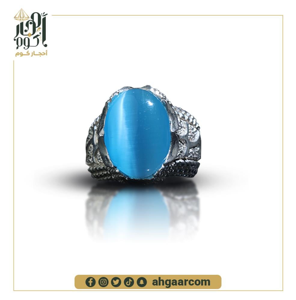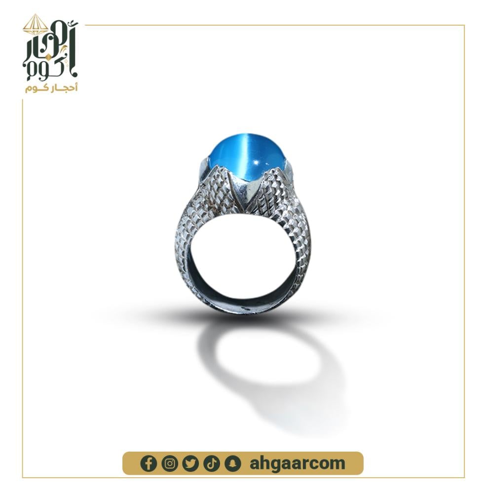 هذا الخاتم الفضي المصاغ يدويًا والمتوج بحجر عين الهر الأزرق الطبيعي يعتبر قطعة احجار فريدة ومميزة بفضل جمال وسحر حجر عين الهر.